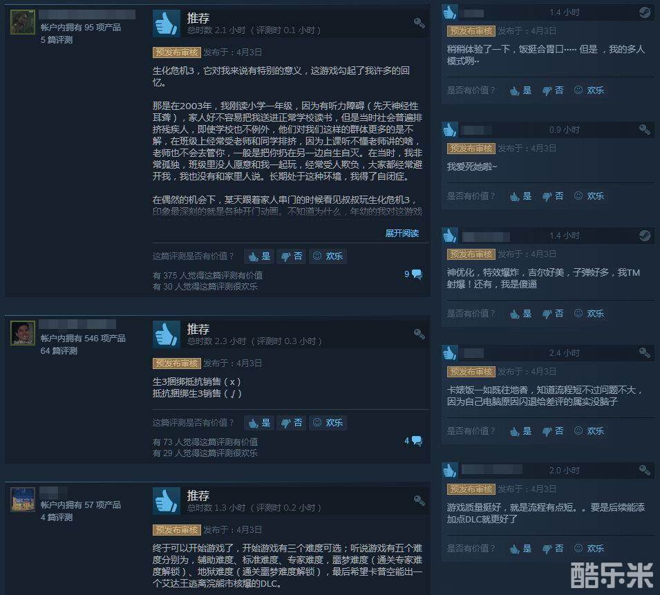 给出好评的玩家认为该作画面有飞跃性提升,优化不错,特效爆炸,冷饭真香!吉尔真美。开局就有触手play,真是太刺激了。该作还加入了许多新机制,真的很酷很好玩。还有老玩家称《生化危机3》陪伴他度过童年,摆脱了自闭症。谢谢卡普空制作了《生化危机3:重制版》,将当年老生化的感觉又带回来了,让其能再次重温经典。