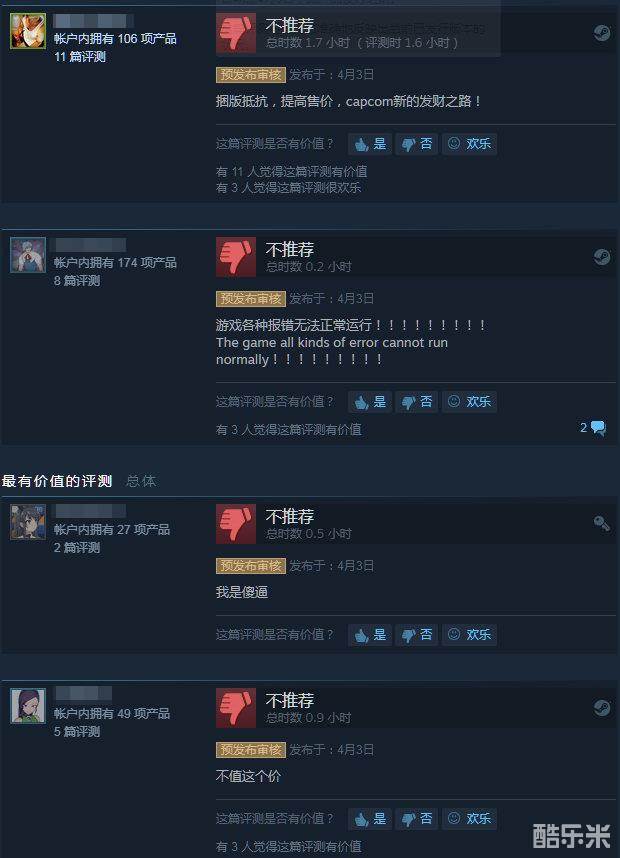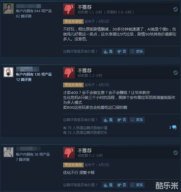 但也有些玩家给出差评,有人表示一运行游戏就黑屏闪退,有人说卡顿太频繁了。还有人称游戏流程太短,抵抗也不好玩,游戏售价偏高了。