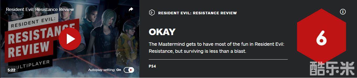 IGN 评分 6分:在《生化危机:抵抗计划》中扮演操纵者(Mastermind)的玩家能享受到游戏的大部分乐趣,但对幸存者而言就是另外一回事了。