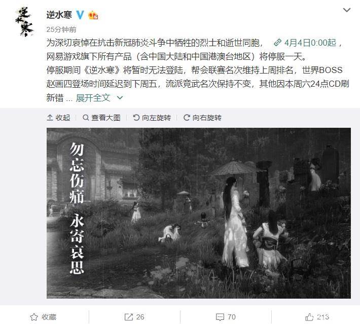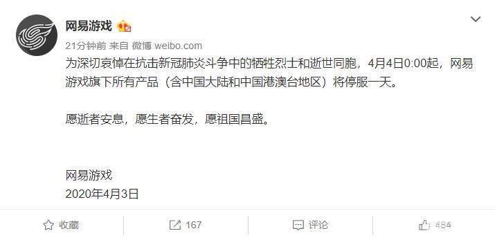 根据网易游戏官方微博的消息,为深切哀悼在抗击新冠肺炎斗争中的牺牲烈士和逝世同胞,4月4日0:00起,网易游戏旗下所有产品(含中国大陆和中国港澳台地区)将停服一天。