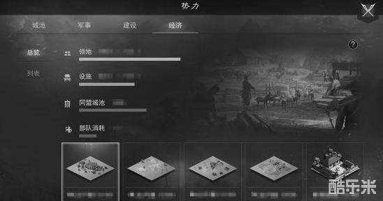 势力界面中保留了城池和军事界面的分页,各位主公仍可从这里便捷的查看城池及部队信息。界面中还包含了建设和经济两个新的分页,分别查看建设值的使用情况,以及当前势力所占领的各类资源领地情况。