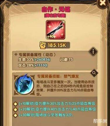 专属技能:怒气爆发,每场战斗至多触发一次,当使用必杀技后,则自己在之后的8秒内将免疫控制效果,并提升20%攻击力与10点吸血等级,+30解锁 每场战斗至多触发3次。