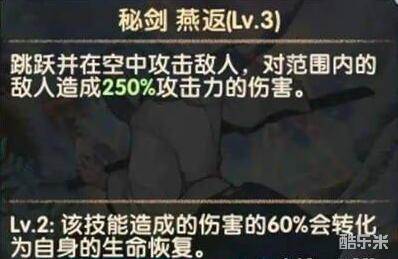 4技能,秘剑 燕返,至多造成290%攻击力的高额AOE伤害,造成的伤害60%会转化为自身的生命恢复,提供续航能力。