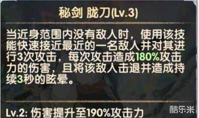3技能,秘剑 胧刀,高频位移技能,是附带击退并造成持续3秒的眩晕,点控。