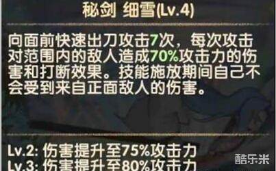 2技能,秘剑 细雪,多段伤害技能,附带打断效果,技能释放期间自己不会受到来自正面敌人的伤害,实测持续时间约为2.5秒。