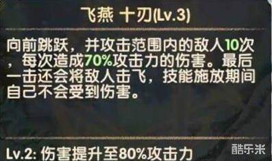 必杀技,飞燕 十刃,高额AOE多段伤害,技能最后一击附带击飞效果,技能释放期间自己不会受到伤害,实测持续时间约为4.5秒的免伤时间。