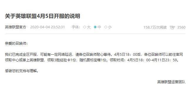 根据《英雄联盟》官网的消息,《英雄联盟》已完成全区开服,可能有一定网络延迟。4月5日18:00后,召唤师可以前往官网领取中心或掌上英雄联盟,领取3胜经验卡1份,随机图标宝箱1份。领取时间为4月5日18:00-4月11日23:59。