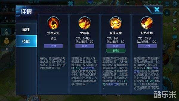 一技能-火球术:安琪拉召唤火球朝指定位置攻击。火球命中英雄后会停止移动并销毁。一技能的攻击距离远,所有火球同时命中敌人后,所造成的伤害是非常高的,用一技能清理兵线也非常省力。