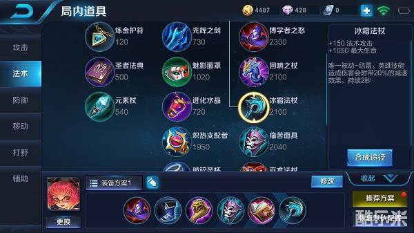 噬神之书增加法术攻击和技能冷却缩减,并增加法术吸血,在使用技能对敌方英雄或小兵造成伤害的同时还能回复血量。冰霜法杖在增加法术攻击的同时还附带减速效果,并回复大量生命值。