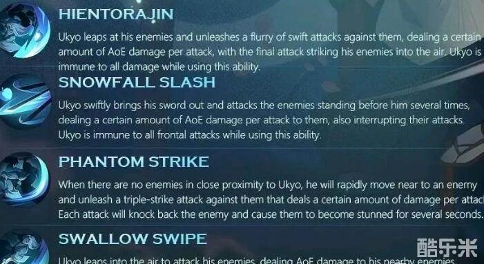 橘右京快速冲向他的敌人,并对他的敌人施加一连串的快速猛攻,每次攻击都会附带一个小范围的aoe伤害,最后一击将会造成中等幅度的浮空效果,浮空将会对小范围内的所有敌人生效,最重要的是这个技能释放期间橘右京是无敌的