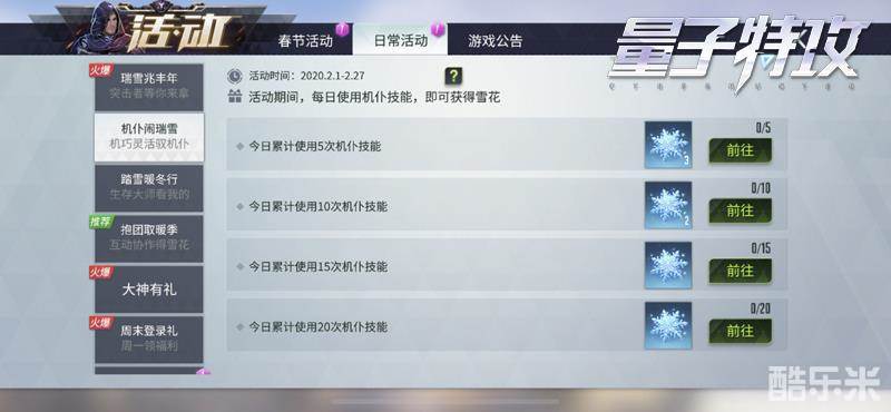 最后编辑于5年前网易超能战术竞技手游《量子特攻》全新瑞雪节活动也正式上线,为漫游者们送上新的外观等丰厚福利,还有春节活动最后几天,各类奖励不要错过!