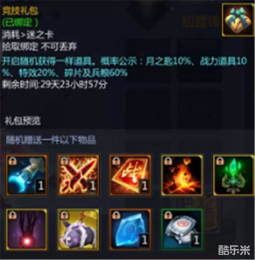 在暖春顽乐会中,玩家们可以通过活动,开启竞技礼包!奖励可以从月之匙、战力双倍(1局)、战力保护卡(1局)、闪耀*逆鳞烈火、孔明灯*水晶之塔、传送*血色轮回、妖刀*小猪黑奇、封灵玉碎片、兵粮卡中随机获得一件道具,看起来又是一件考验大家欧气的东西哦~