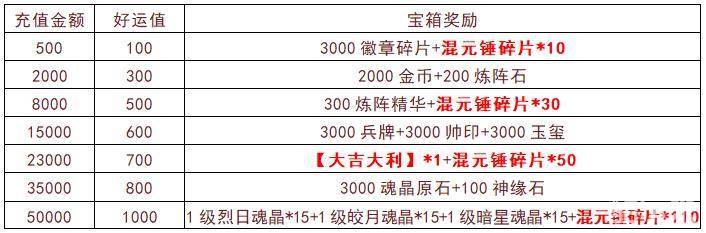 【活动内容】活动期间可通过充值金币获得好运值,积累好运值即可打开宝箱奖励,闪耀称号,全新神器,绝对超值的提升战力资源,尽在特惠好礼。