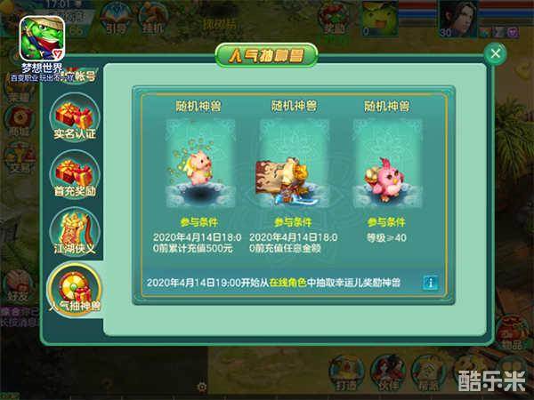 《梦想世界》手游跨平台新服“春花秋月”将于4月10日正式开启。《梦想世界》手游人气抽神兽玩法来袭!活动期间登录游戏即可获得抽神兽资格,满足条件更可最多连抽3次,3只神兽你来拿。还有新服冲榜得变异还童丹以及新手礼包、签到礼包、微信月礼包、2980邮箱奖励等众多礼包助力少侠快速升级。