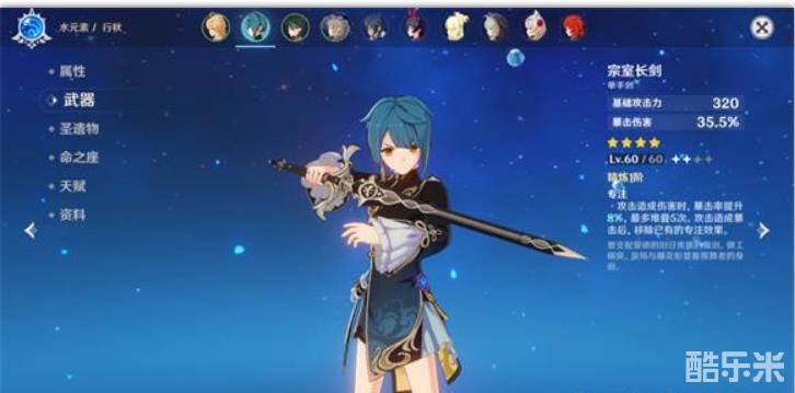 宗室长剑本身可以通过频繁的攻击提高自身打出暴击的概率,如果没有暴击那么暴击率也能持续增长到最高百分之40直到暴击为止。自身由于是四星武器身材也不俗,自带的额外暴击伤害副词条算是额外的惊喜也非常契合我对行秋的主攻角色定位。
