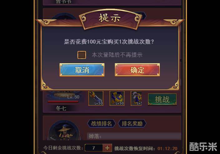 玩家每天挑战BOSS次数是有限制的,每日00:00点刷新挑战次数。刷新后无论当前剩余多少次数,直接为玩家补满至10次。除了每天00:00刷新的挑战次数之外,如果玩家剩余挑战次数低于10次,每2小时会自动恢复1次挑战次数。当然,玩家也可以花费元宝购买挑战次数,每天第一次购买为50元宝,购买次数越多花费的元宝也越多。