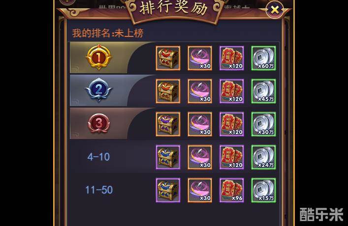 BOSS被击杀后,对BOSS造成伤害进入前50名的玩家可获得排名奖励,奖励会通过邮件进行发放。奖励包括橙装排名宝箱、兑换券、玄女帛、银两等等。除此之外,对BOSS打出最后一击的玩家还能获得额外的银两奖励。