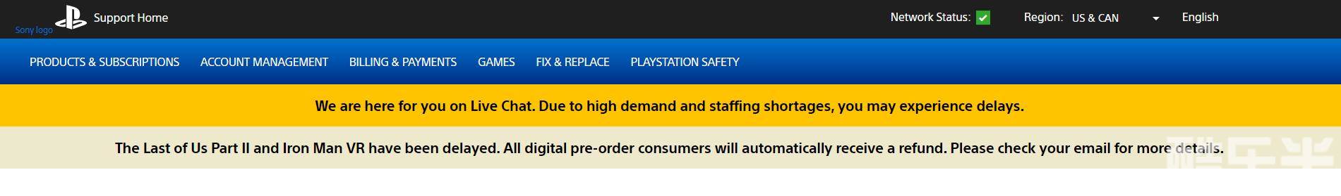 “《最后的生还者2》和《漫威钢铁侠VR》已被延期。所有数字预购的消费者将自动收到退款。更多细节请查看你的邮箱。”