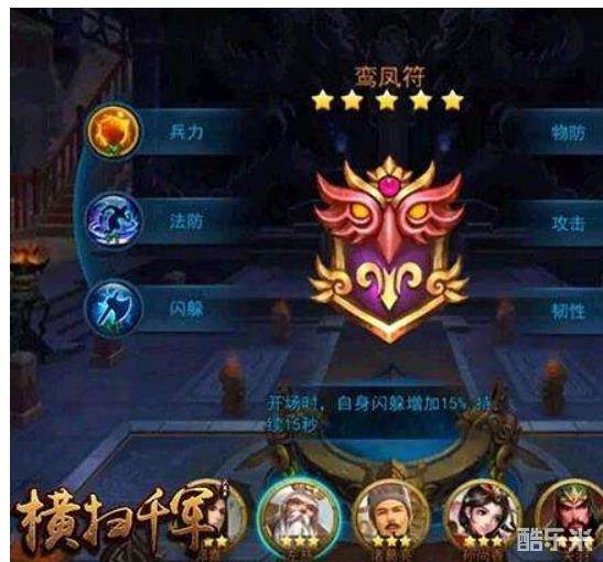 3、兵符属性。兵符可以提升武将的各种属性,大家可以根据兵符的说明选择使用。这里主要说下橙色兵符,橙色兵符除了每级加成更高外,橙色兵符具有一个特殊属性,是开场就提供的。橙色兵符有以下几种:青龙、白虎、鸾凤、玄武、麒麟五种。青龙主攻击,开场提升命中;鸾凤主兵力,开场提升闪避;玄武主防御,开场提升韧性;白虎主命中,开场增加防御;麒麟主破击,开场增加破击。但开场增加多少,并没有数据体现,所以无法知道,但使用效果来看,还不错。