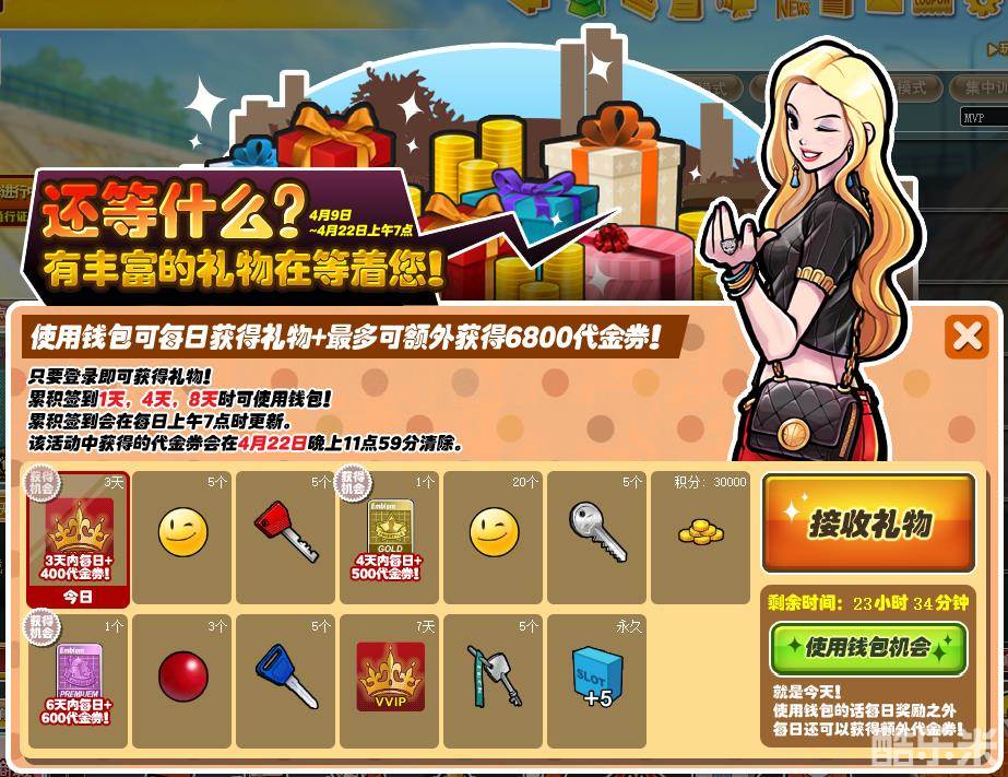 玩家只需登录即可获得礼物,使用钱包可每日获得礼物+最多可额外获得688代金券,累计签到1天,4天,8天时可使用钱包。