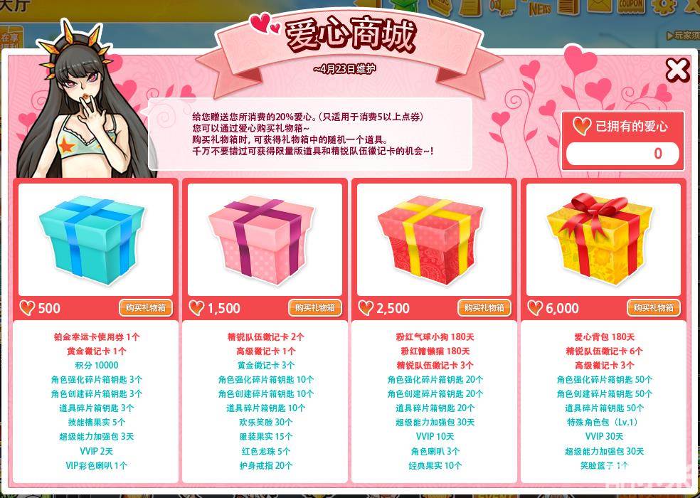 给您赠送您点券消费的20%的爱心。(5点券以上的消费,不含代金券)可以通过爱心购买爱心礼物箱,购买礼物箱可获得对应礼物箱中的随机一件道具。