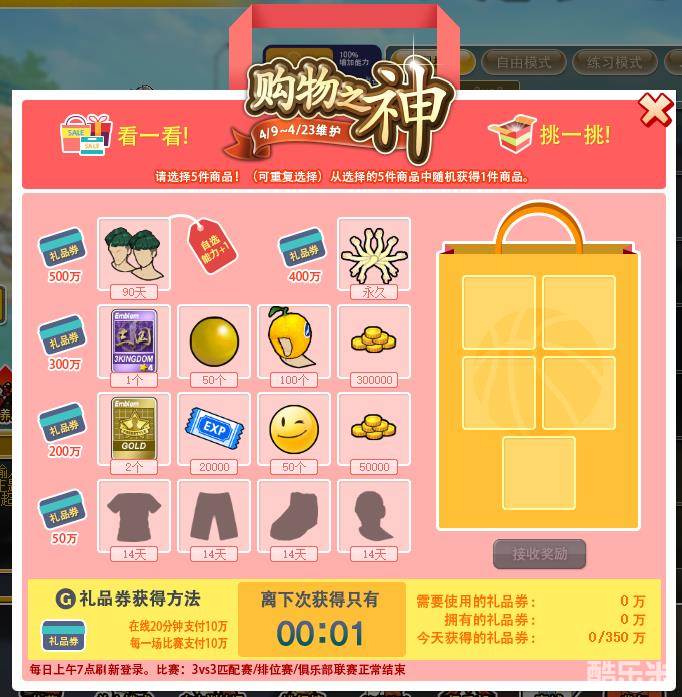 每日“礼品券”获得上限为300万。“礼品券”可用于抽取活动界面中的道具。抽取时可选择5件商品(可重复选择),从选中的5件商品中随机获得一件商品。