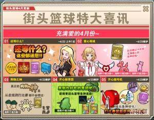 《街头篮球》全新版本将于4月9日正式上线,充满爱的4月份来了,还等什么签到得好礼,爱心商城购买队伍徽记卡外加充满爱心的装饰,真正的购物之神从在线到打比赛都不会错过,制作青团获得青团头套等奖励,开心摇号机打比赛就能获得摇号机会!