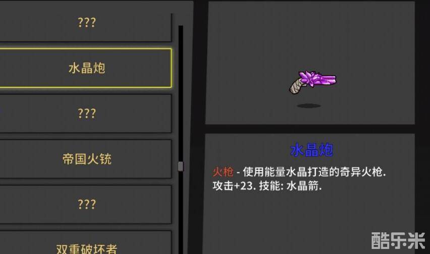 我们可以从名字上看出来,这把武器以及玩玩全全不是我们之前所介绍的燧发枪的范畴了,直接上升到了炮的级别,这也意味着水晶炮有着非常惊人的伤害,而他的技能在,则是释放出一个想飞刀一样的水晶箭,直接穿透敌人攻击,伤害爆炸;