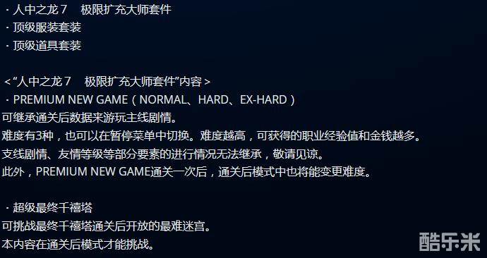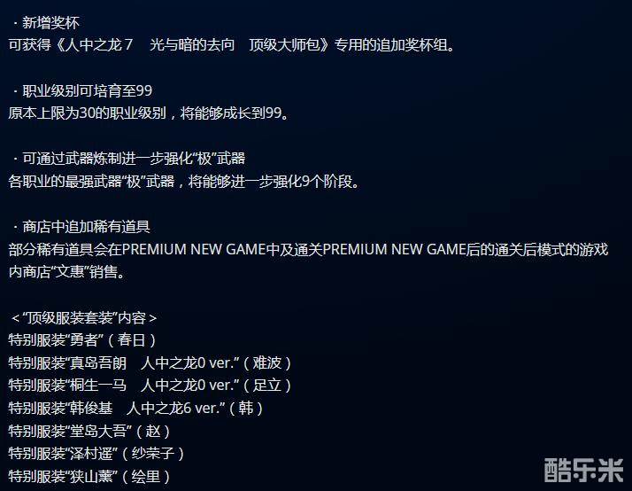 感兴趣的玩家可以点击此处获得PlayStation港服《如龙7》追加DLC“顶级大师包”,此次新DLC新增多项深度游玩要素的扩充套件,适合已通关游戏的玩家。