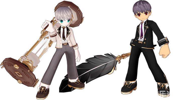 男生们的修身长裤、小领带上衣将他们装扮的阳光帅气。该套时装的武器也是非常独具一格,形象的羽毛元素制成的各种笔类,书本支架,亦或沙漏等等,创意十足。