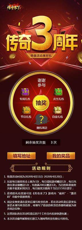除此之外呢,玩家在活动期间前往《九翎网络》官方微博参与“《传奇来了》三周年庆典活动”,同样也有几率直接获得包括周边实物等在内的多重超级豪华大奖!