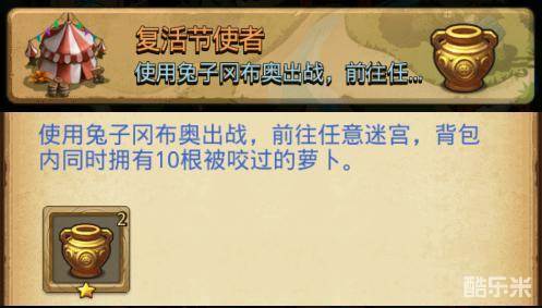 任务需求冒险者使用兔子冈布奥出战任意迷宫,背包内同时拥有10根被咬过的胡萝卜。
