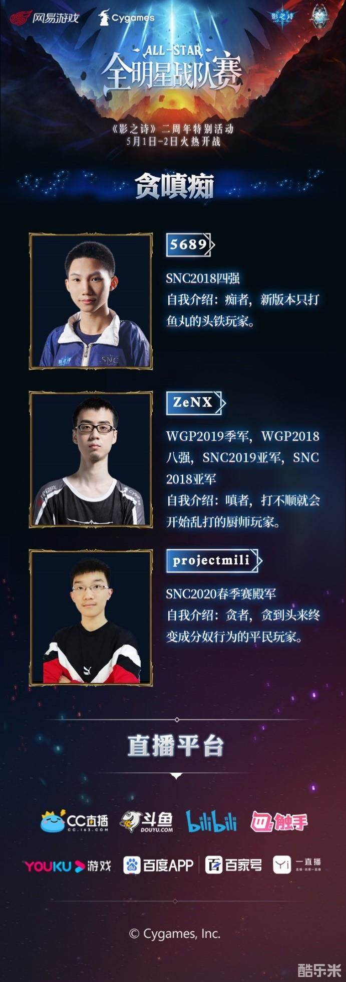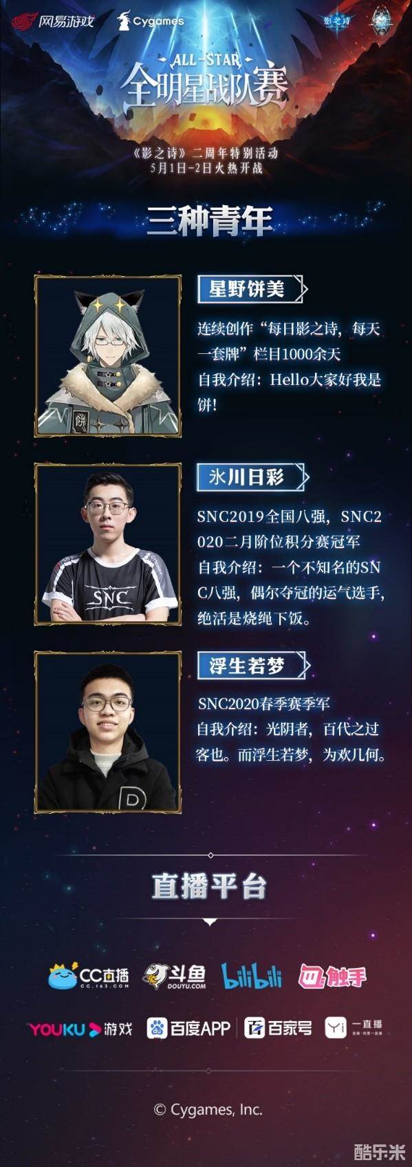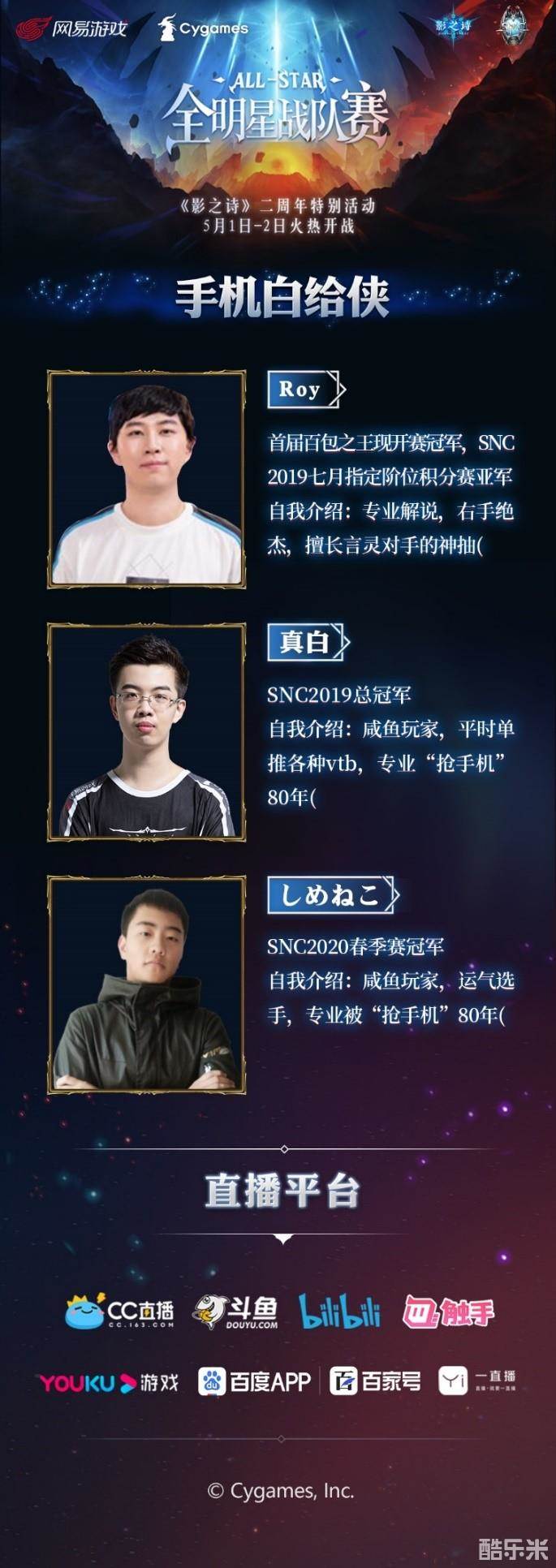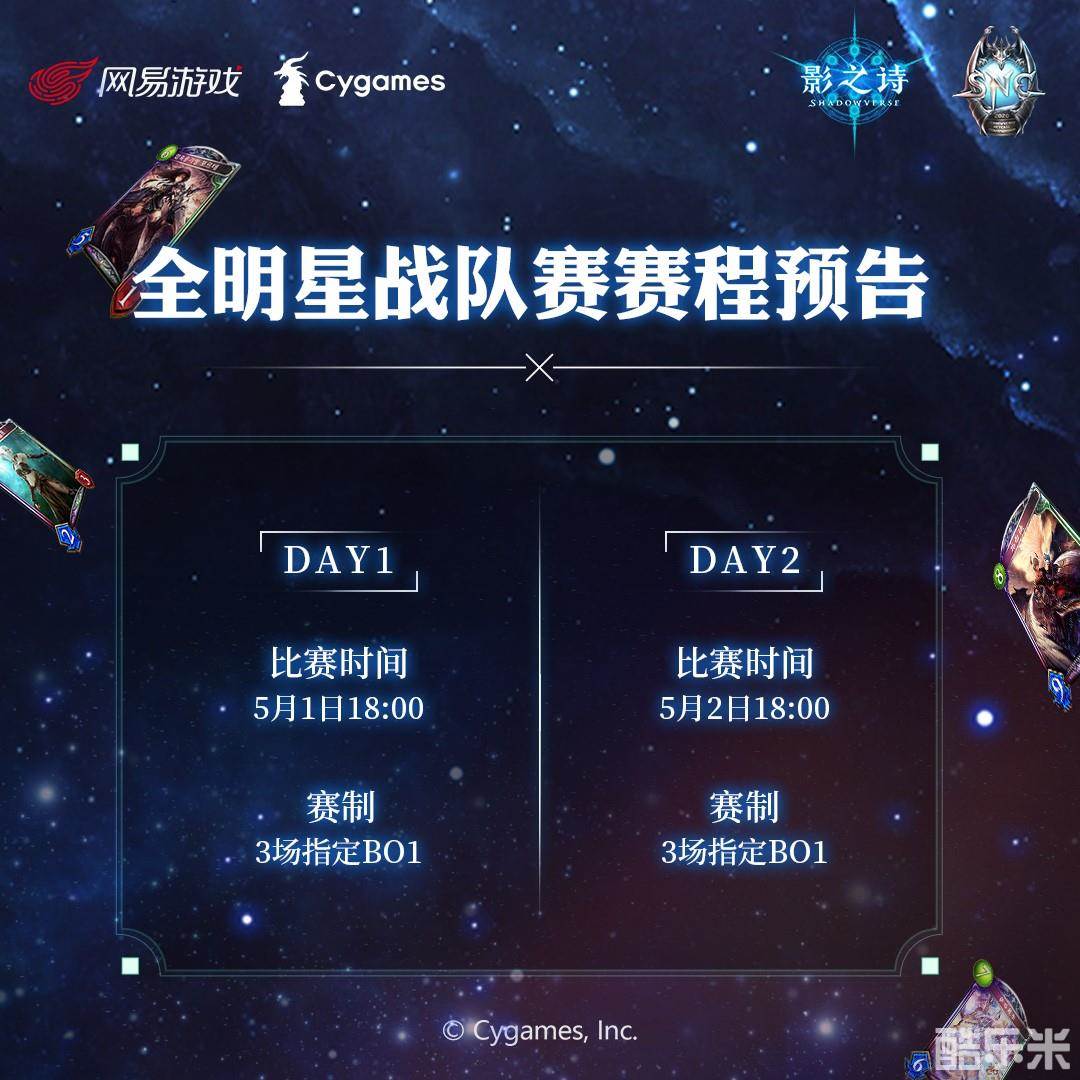 本次全明星战队赛将于5月1日-2日每晚18点火热进行,《影之诗》人气主播、SNC明星选手、SNC2020春季赛四强共12名选手将分为四支战队,参与战队赛的比拼,最终谁能夺得头筹,敬请期待!