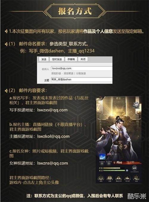 本次“大神崛起计划”的征集活动面向所有玩家,玩家只需要将作品以及个人信息发送至指定邮箱即可报名。值得一提的是,玩家需要严格按照邮件命名要求(参选类型_联系方式)方可成功报名。而邮件内容也有相应的要求,玩家的君主界面游戏截图必不可少,还需要根据三大选拔线的对应要求进行调整,写手需要带上发表或未发表的乱世相关作品,主播则需要带上直播间链接,女神需要附上照片或短视频。所有玩家还可以加入官方指定的QQ群或微信群获取更多信息,除此以外还能在微社区、微信圈、QQ部落、官方贴吧的活动专区进行提问。