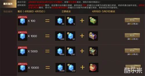 活动期间,投入不同档位的魔石,即刻返还20%的魔石,并额外赠送绑魔。100、1000、5000、10000,四档魔石任君选择,每个档位仅限投入10次。剩余的80%魔石分4次返还,且额外赠送绑魔。
