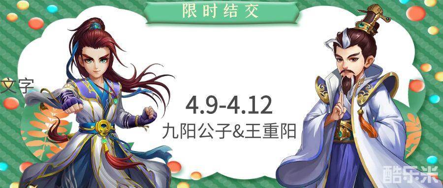 活动说明:活动期间,同时开启王重阳和九阳公子的限时结交活动,少侠每日可消耗元宝换取限时结交颠倒阴阳王重阳、大范围控制内劲九阳公子的机会!