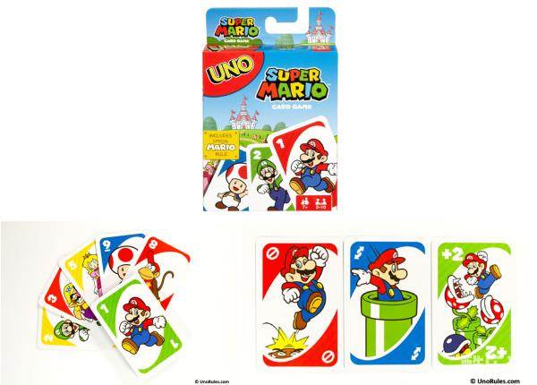 2016年,美泰公司发售了一款和超级马里奥联动的UNO限定卡牌。在此次联动版本中,大家熟悉的UNO传统元素之一——数字被缩小到了卡牌对角位置,取代其“中心”地位的,则是大家熟悉的马里奥、路易吉、黛西公主等超级马里奥游戏人物。就连游戏的大boss——库巴大魔王,也被巧妙地安排到UNO最重要的功能牌——+4牌牌面上。