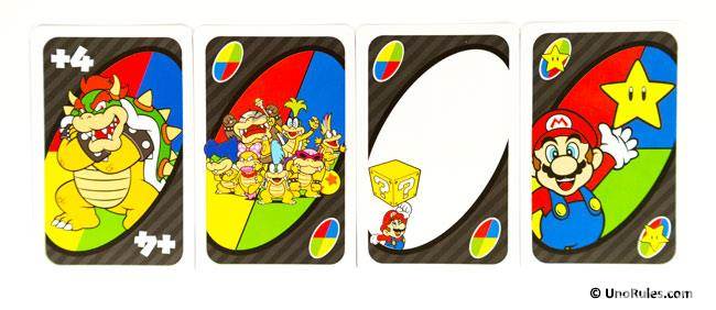(UNO Super Mario中的万能牌组:除了普通UNO已有的+4、调色和自定义规则牌,UNO Super Mario还有独特的Super Star Card功能牌,用以反弹+2和+4功能)
