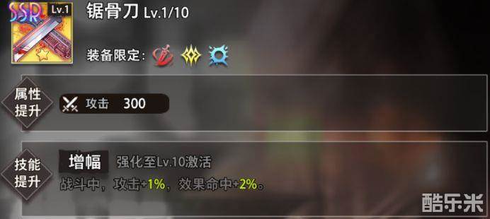 锯骨刀的攻击加成是非常多的,可以让上泉萤输出更高,同时如果强化到10级的话还能增加攻击百分比和命中率,命中率的提升也是很关键的,可以保证我们的输出,在战斗的时候会减少出现打不中的情况,一旦打不中我们是无法对敌方造成任何威胁的。