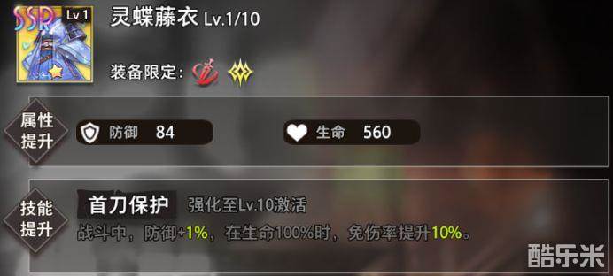 灵蝶藤衣是可以增加我们防御和生命值的,这样的话是可以提升上泉萤一定的坦度的,在战斗的过程中可以承受更多的伤害,如果强化到10级的话还可以增加免伤率,免伤率是有条件的只有满血才会触发,但如果真的触发了是可以免疫伤害的,还是很恶心的。