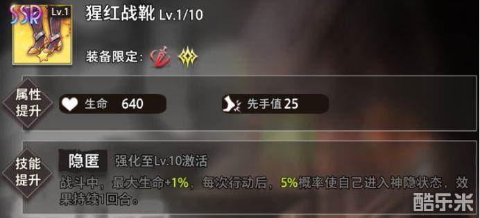 猩红战靴可以增加我们的先手值,如果我们的先手值很高的话在对战中就可以先手攻击,这样我们可以对敌方优先造成伤害,上泉萤是有控制能力的,所以最好先手使用,可以对敌方后排起到一个控制的效果。