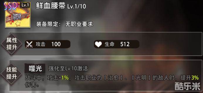 鲜血腰带可以增加攻击和生命这个还是很常规的,是上泉萤所需要的属性,如果强化到10级的话还可以对治愈和光明职业的敌人造成额外的伤害,这样可以增加一定的输出能力。