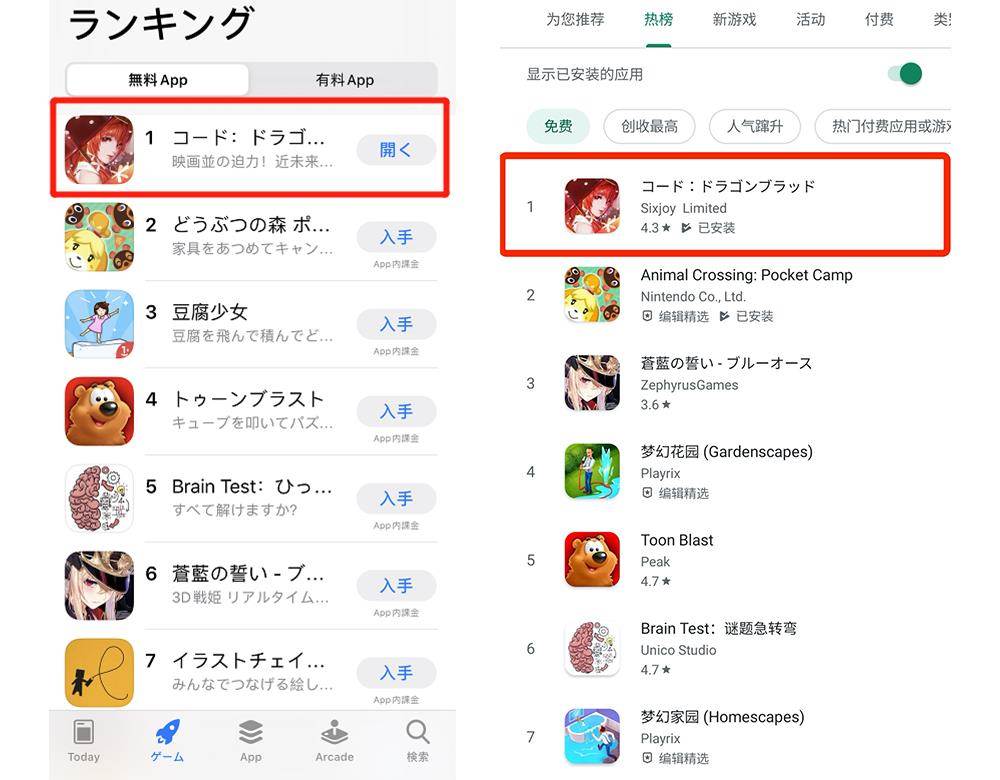 4月9日,由腾讯游戏发行,祖龙娱乐研发的MMORPG手游《龙族幻想》《コード:ドラゴンブラッド》(Code:D-Blood)在日本正式上线。在预注册量突破百万的基础上,预下载开放不到6小时,《龙族幻想》便火速登顶App Store免费榜,开服后不久也登顶Google Play免费榜,成为了2020年首个问鼎日本手游下载榜单的国产MMO游戏。
