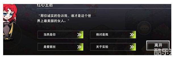 需要注意的是,在下面对话选项中,若队长大人选择【绝对是我】(无任何效果)或【是爱丽丝】(获得debuff),则会导致【红心王后不想理你】,进而无法选择【关于实验】选项来完成探索任务喔。选择【当然是你】则获得【红心王后的爱意】增益buff,此时依旧可以选择【关于实验】选项。如果队长大人不小心出现了【红心王后不想理你】的情况,建议下一次探索再完成好了。