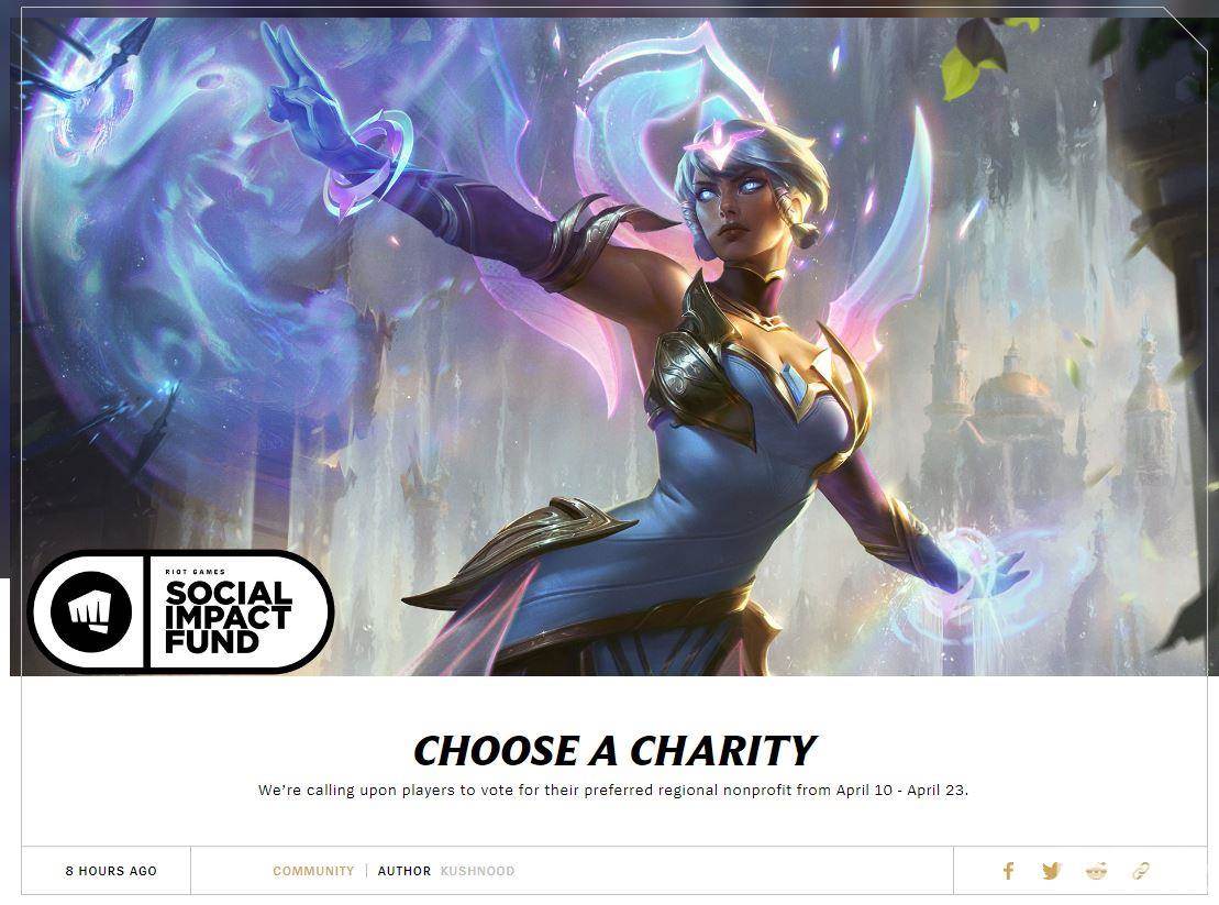 拳头方面表示,他们目前已经在全球各地选出了46个非营利的慈善公益组织,现在决定在北京时间4月11日至23日期间开启玩家投票,藉此来确认善款的最终去向。据拳头方面的描述,他们根据“黎明使者卡尔玛”皮肤的收入比例,在每个地区设定了善款池。而各个区服的玩家可以从所在地区的三个公益组织中选择一个,最终得票数最高的可获得善款池中50%的金额,其余两家获得25%。
