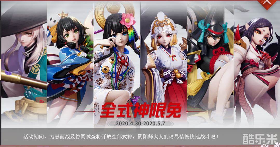 全式神限免活动,也将于4月30日维护后-5月7日限时开启!活动期间,为崽而战及协同试炼模式将为大人们开放全部式神。大人们也将有机会携手心爱的式神,与好友一起畅快战斗!