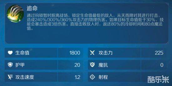 飞天铁爪需要三费才能入手,技能名为追命,效果是暂时脱离战场然后锁定生命值最低的敌人进行攻击,可以造成不少的物理伤害,如果敌人的血量少于30%会直接出发暴击打出三倍的伤害,如果斩杀了敌人会返还80%的冷却时间和80的魔力值。这个棋子在场上作为收割简直再好不过了,关键是不需要保护自己就有很高的生存能力哦,可以组合的阵容也很多。