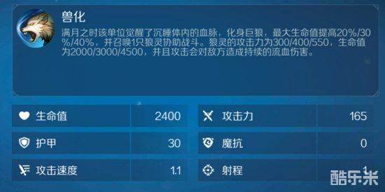 狼人需要三费才能购买,技能名为兽化。效果是变身成为巨狼生命值会提高20%/30%/40%,并且还能召唤出一只狼一起来作战,召唤出的浪攻击力是300/400/550,生命值为2000/3000/4500,这两点都是随着星级的提升而提升的,狼灵攻击敌人会造成流血效果哦。这个棋子的羁绊是人类、野兽、战士,超多的羁绊搭配阵容也是相对容易的,大家可以随意发挥。