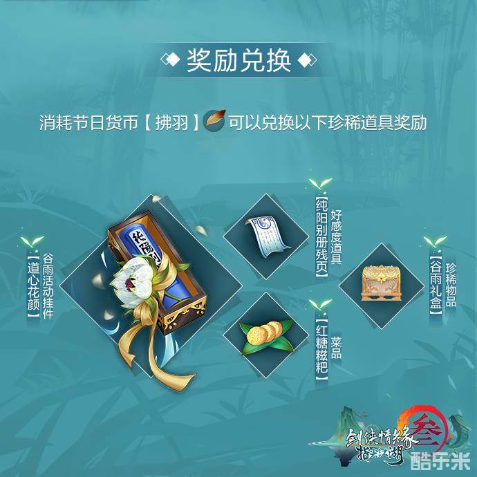 通过节日活动及日常活动获得的节日货币【拂羽】,可用于兑换节日限定腰部挂件【道心花颜】、谢云流好感度道具【纯阳别册残页】、可食用菜品【红糖糍粑】、珍稀道具【谷雨礼盒】(必得【一级五行石】,有几率开出【未锻打的飞仙玄晶】【达摩悟性论残页】【天机秘钥部件】等诸多好礼)。
