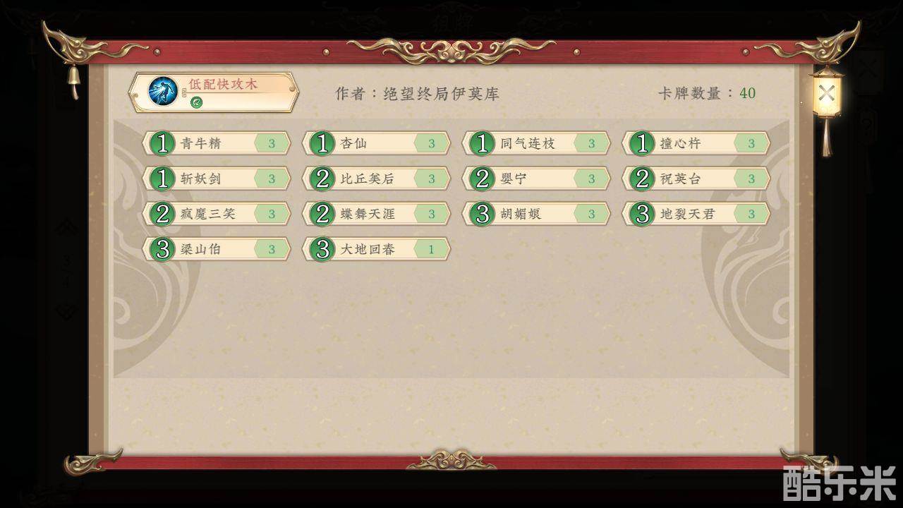 这套卡组强度非常高,因为斩妖剑现在非常的强力,如果你运用熟练的话上尊也是可以的,另外这套卡组搭配很便宜推荐玩家们去试试。